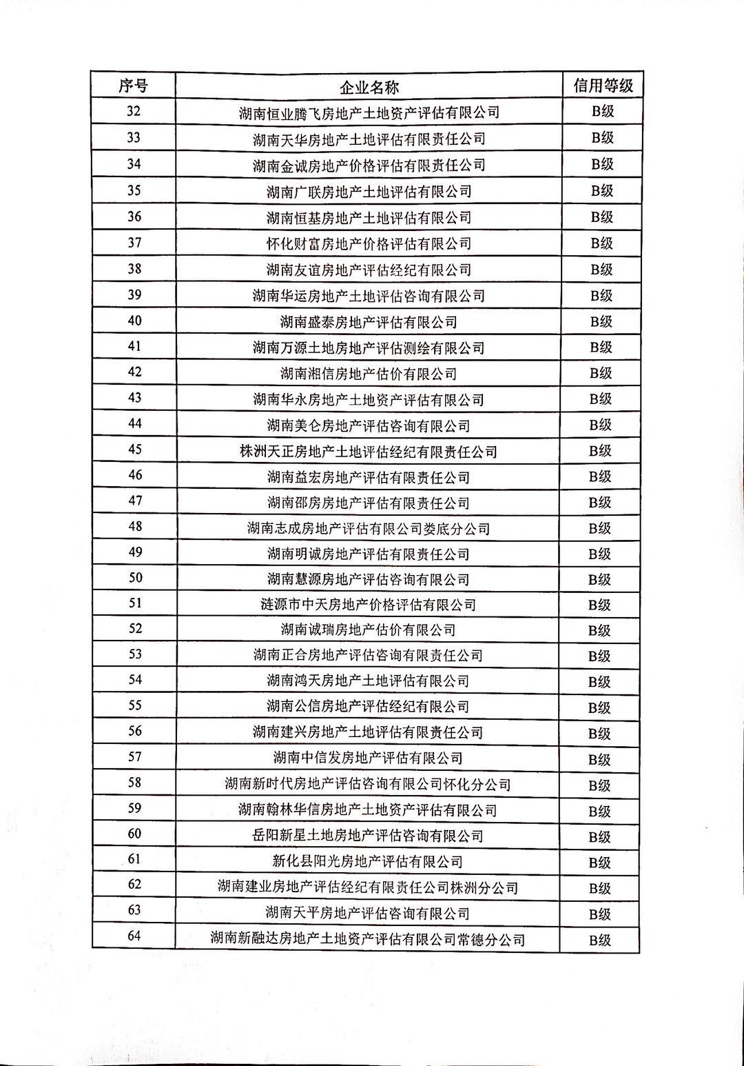 根據《湖南省房地產業協會房地產行業信用評價管理辦法(試行)》(湘房協〔2018〕15號)相關規定,我會按程序對全省158家評估機構進行信用評價,其中信用等級為A級的企業14家,信用等級為B級的企業53家,信用等級為C級的企業76家,信用等級為D級的企業6家,無等級9家,現予公布。