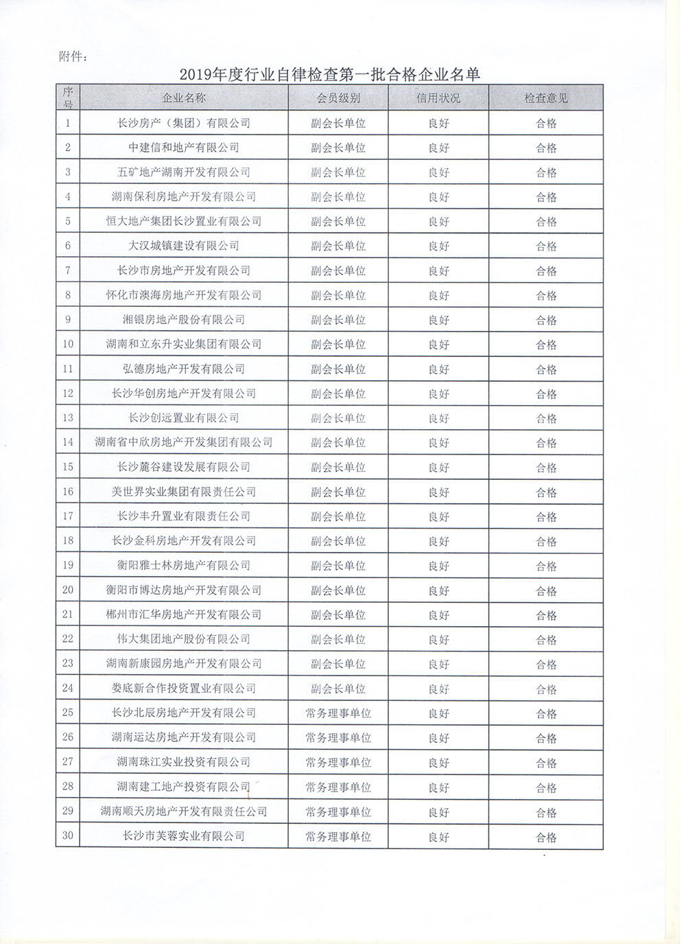 依據《國務院關于促進市場公平競爭維護市場正常秩序的若干意見》(國發〔2014〕20號)、《湖南省房地產行業信用信息管理辦法》(湘建房〔2011〕196號)等有關規定,省房協開發委對全省房地產開發會員企業開展了2019年度行業自律檢查工作。為保證自律檢查公開、公平、公正,現將195家合格企業名單予以上網公吿,可在湖南省房地產行業信用信息平臺、湖南省房地產業協會官網和湖南省房地產業協會微信公眾號上查詢,接受社會監督。(檢查意見詳見附件)。
