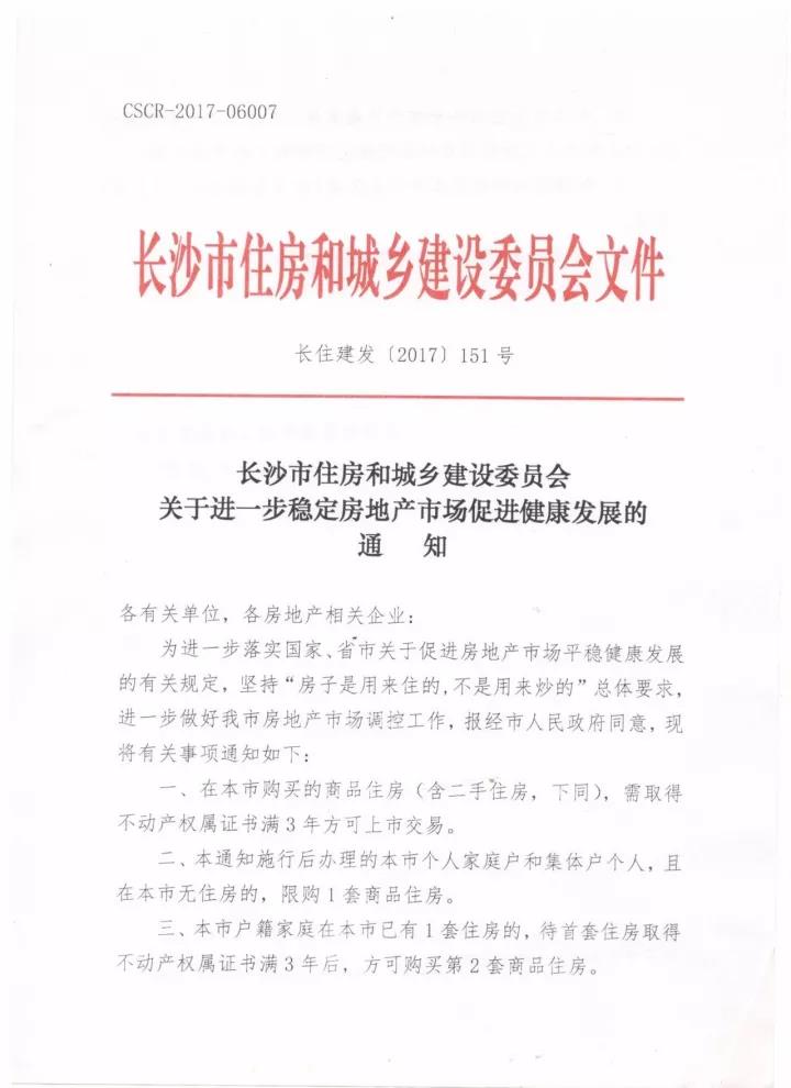 為進(jìn)一步落實(shí)國(guó)家、省市關(guān)于促進(jìn)房地產(chǎn)市場(chǎng)平穩(wěn)健康發(fā)展的有關(guān)規(guī)定,做好長(zhǎng)沙房地產(chǎn)市場(chǎng)調(diào)控工作,經(jīng)市政府同意,市住建委在原有調(diào)控政策基礎(chǔ)上,再次“加碼”,出臺(tái)該通知。通知全面強(qiáng)化了住宅的“居住屬性”,堅(jiān)決抑制其“投資屬性”,規(guī)定“在本市購買的商品住房(含二手住房),需取得不動(dòng)產(chǎn)權(quán)屬證書滿3年方可上市交易”。