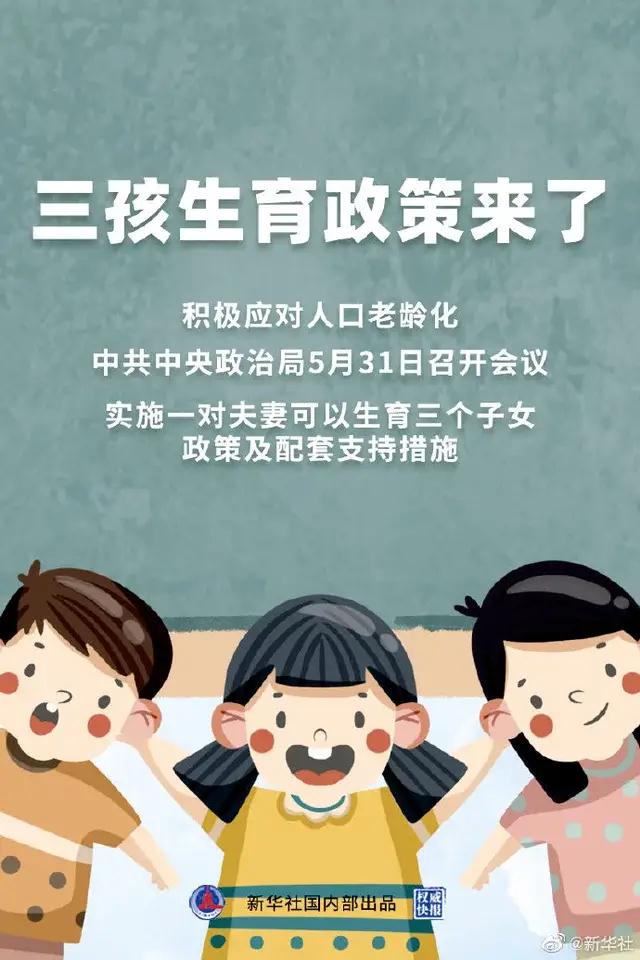 新華社5月31日消息,積極應對人口老齡化,我國將出臺重大政策舉措。中共中央政治局5月31日召開會議,會議指出,進一步優(yōu)化生育政策,實施一對夫妻可以生育三個子女政策及配套支持措施,有利于改善我國人口結(jié)構(gòu)、落實積極應對人口老齡化國家戰(zhàn)略、保持我國人力資源稟賦優(yōu)勢。