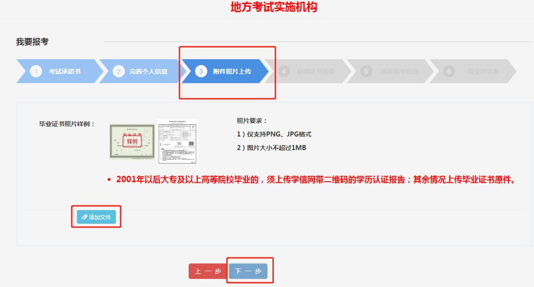 16.上傳畢業(yè)證書照片。(照片僅支持PNG、JPG格式,大小不超1MB;2001年以后大專及以上高等院校畢業(yè)的,須上傳學(xué)信網(wǎng)帶二維碼的學(xué)歷認(rèn)證報(bào)告;其余情況上傳畢業(yè)證書原件)