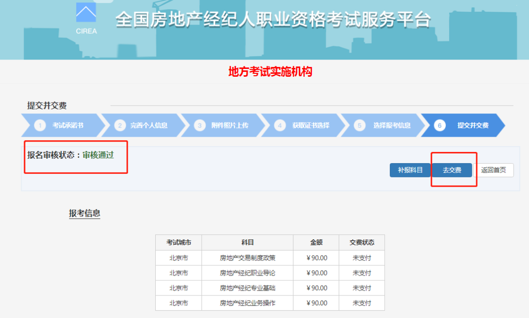 23.報(bào)名審核狀態(tài)顯示:審核通過。說明報(bào)名成功,點(diǎn)擊“去交費(fèi)”掃碼繳費(fèi)即可。(注意:報(bào)名成功以交納考試費(fèi)為準(zhǔn))
