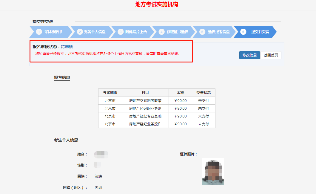 22.報(bào)名審核狀態(tài)顯示:待審核。說明提交成功,等待審核即可(地方考試實(shí)施機(jī)構(gòu)將在3~5個(gè)工作日內(nèi)完成審核,請(qǐng)屆時(shí)查看審核結(jié)果)