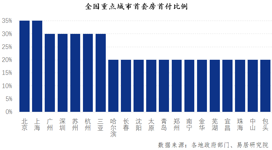 根據(jù)易居研究院監(jiān)測(cè),目前全國(guó)20個(gè)重點(diǎn)城市首套房首付比例平均值為24%,首付比例主要分為35%、30%和20%三檔。