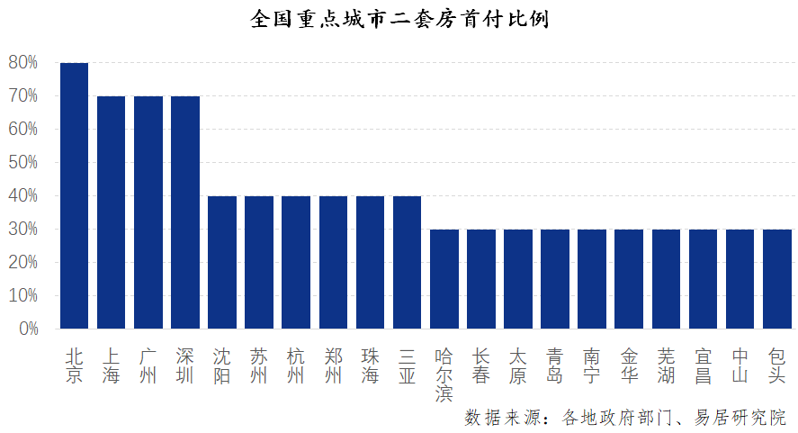 具體來(lái)看,北京二套房的首付比例最高,最多可達(dá)80%;上海、廣州和深圳也高達(dá)70%。此外,包括哈爾濱、長(zhǎng)春和太原等二線(xiàn)城市,其二套房的首付比例僅為30%的水平。
