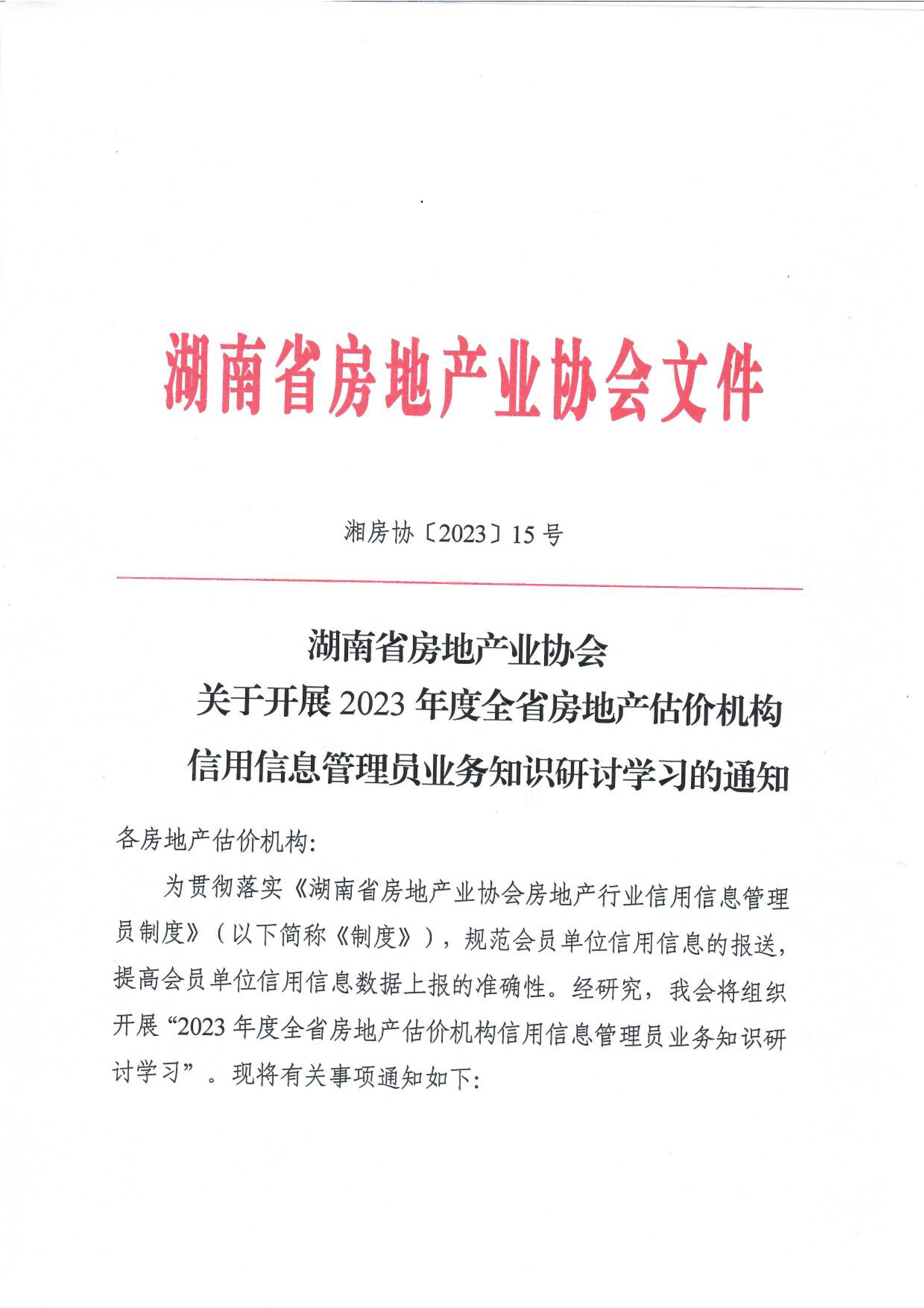 為貫徹落實(shí)《湖南省房地產(chǎn)業(yè)協(xié)會(huì)房地產(chǎn)行業(yè)信用信息管理員制度》(以下簡(jiǎn)稱《制度》),規(guī)范會(huì)員單位信用信息的報(bào)送,提高會(huì)員單位信用信息數(shù)據(jù)上報(bào)的準(zhǔn)確性。經(jīng)研究,我會(huì)將組織開展“2023年度全省房地產(chǎn)估價(jià)機(jī)構(gòu)信用信息管理員業(yè)務(wù)知識(shí)研討學(xué)習(xí)”。現(xiàn)將有關(guān)事項(xiàng)通知如下: