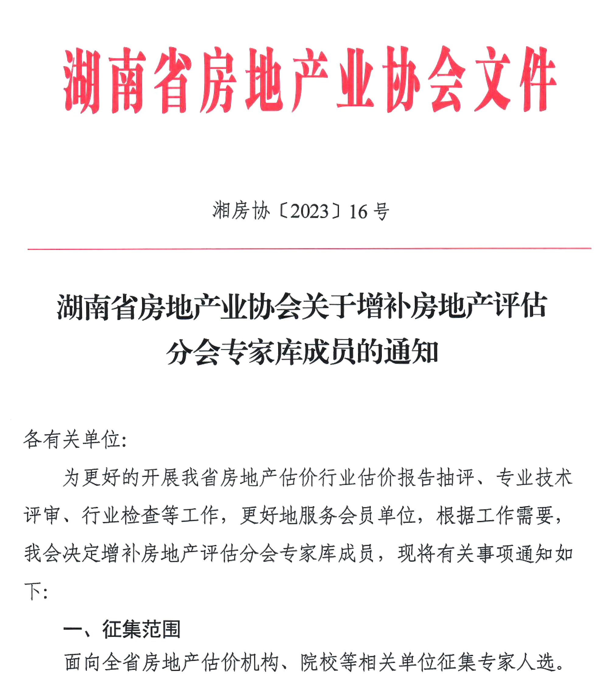 湖南省房地產(chǎn)業(yè)協(xié)會(huì)關(guān)于增補(bǔ)房地產(chǎn)評估分會(huì)專家?guī)斐蓡T的通知