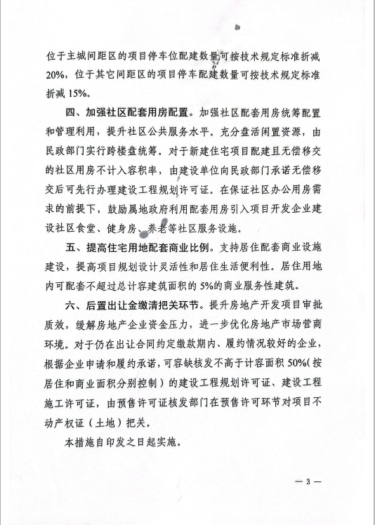 第三,優(yōu)化項目報建環(huán)節(jié),小幅緩解開發(fā)商資金壓力。針對履約較好的企業(yè),可容缺核發(fā)不高于計容面積50%(按居住和商業(yè)面積分別控制)的建設工程規(guī)劃許可證、建設工程施工許可證,有利于開發(fā)商報建具體手續(xù)辦理環(huán)節(jié),確保報建更靈活便捷。
