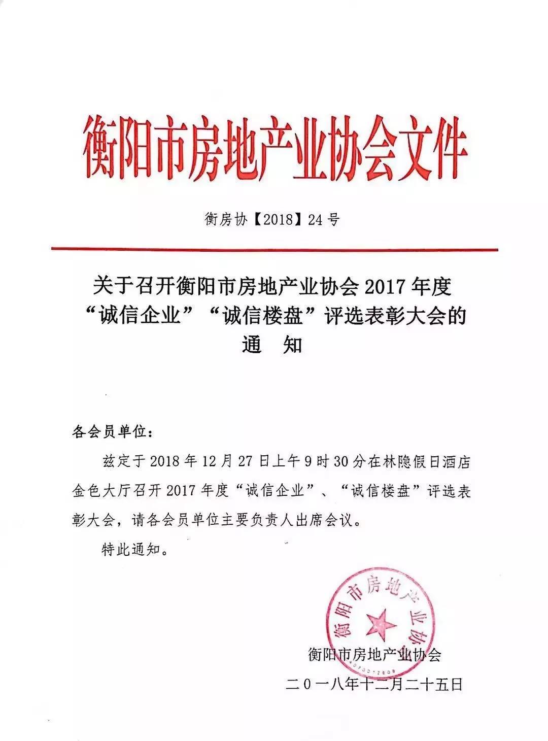 2017年度衡陽市房地產行業“雙誠”評選結果表彰決定