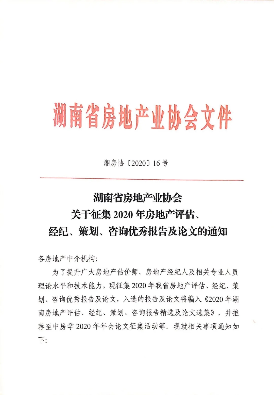 為了提升廣大房地產估價師、房地產經紀人及相關專業人員理論水平和技術能力,現征集2020年我省房地產評估、經紀、策劃、咨詢優秀報告及論文,入選的報告及論文將編入《2020年湖南房地產評估、經紀、策劃、咨詢報告精選及論文選集》,并推薦至中房學2020年年會論文征集活動等?,F就相關事項通知如下: