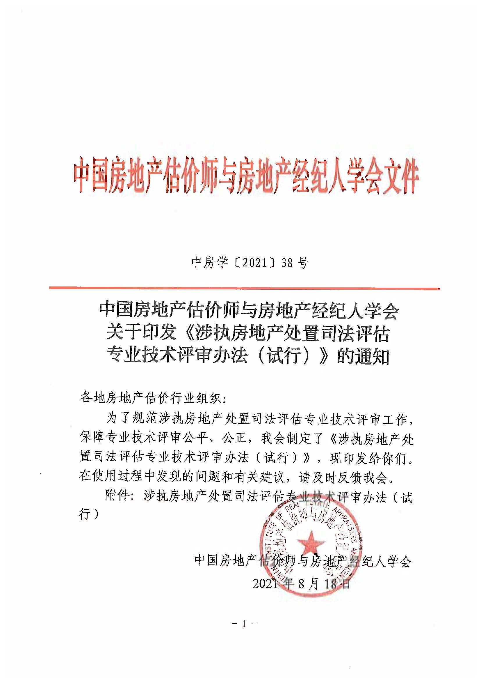 中國房地產估價師與房地產經紀人學會關于印發《涉執房地產處置司法評估專業技術評審辦法(試行)》的通知