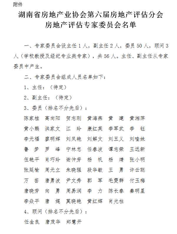 關于湖南省房地產業(yè)協(xié)會第六屆房地產評估分會房地產評估專家委員會名單的公示