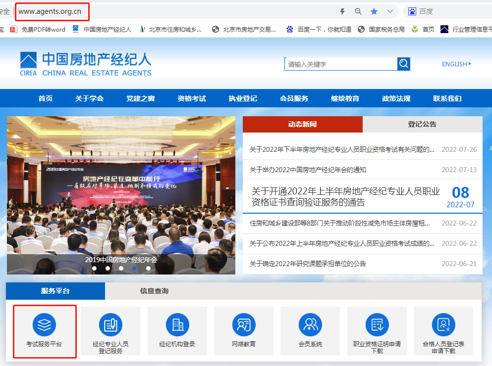 1.登錄中國(guó)房地產(chǎn)經(jīng)紀(jì)人官網(wǎng)(http://www.agents.org.cn),點(diǎn)擊“考試服務(wù)平臺(tái)”。(推薦使用谷歌、火狐、360極速瀏覽器或IE10及以上版本瀏覽器)?