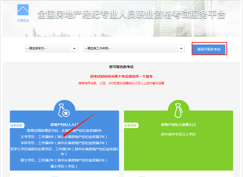 2.選擇相應(yīng)學(xué)歷和工作年限,點(diǎn)擊“查詢可報(bào)名考試”,選擇進(jìn)入房地產(chǎn)經(jīng)紀(jì)人入口。
