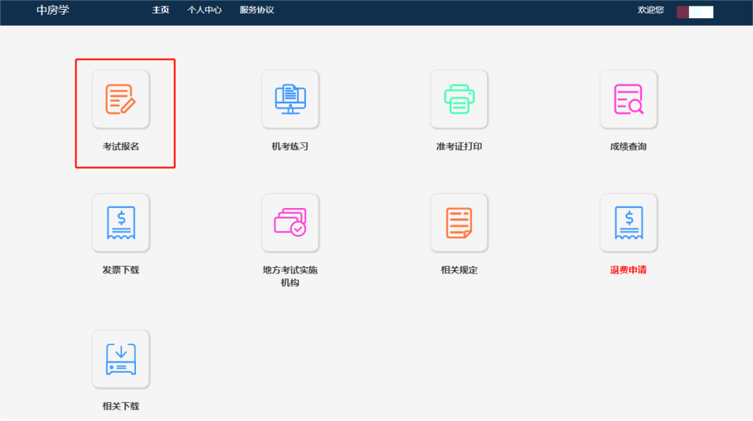 3.點(diǎn)擊“考試報(bào)名”。(工作證明模板在這個(gè)界面的相關(guān)下載里,后期申請(qǐng)退費(fèi)、打準(zhǔn)考證、開發(fā)票、機(jī)考練習(xí)、成績(jī)查詢等都在這個(gè)頁(yè)面,請(qǐng)留意)