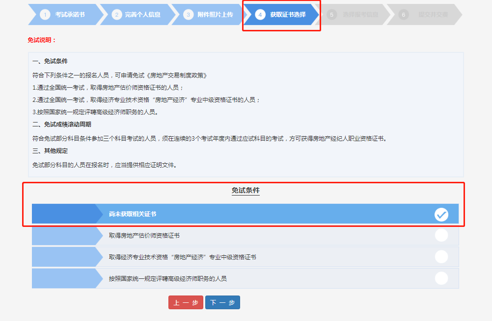 19.選擇相應(yīng)的免試條件。(如沒有免試條件,選擇“尚未獲取相關(guān)證書”,點(diǎn)擊“下一步”)