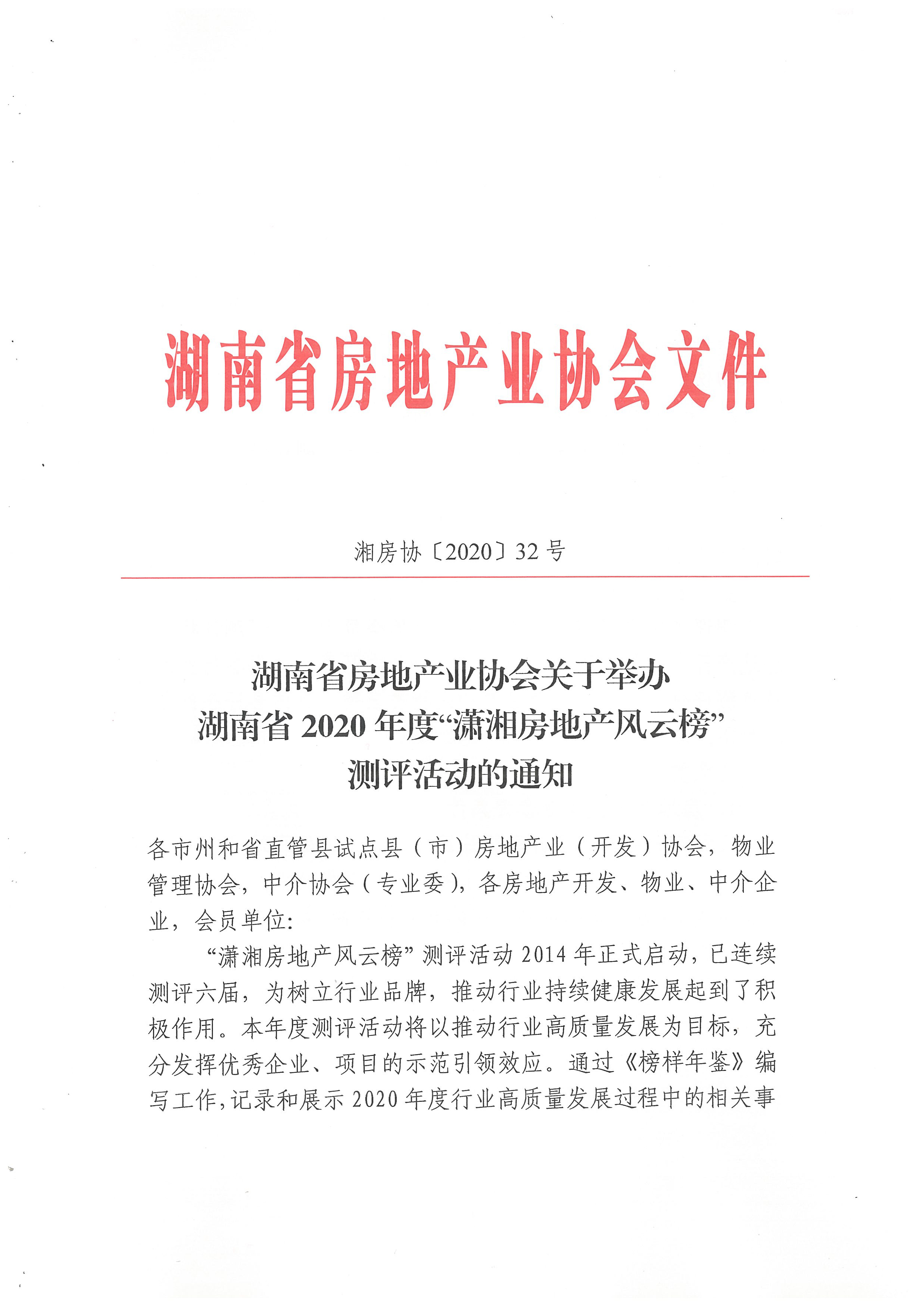 關(guān)于舉辦湖南省2020年度“瀟湘房地產(chǎn)風(fēng)云榜”測評活動(dòng)的通知