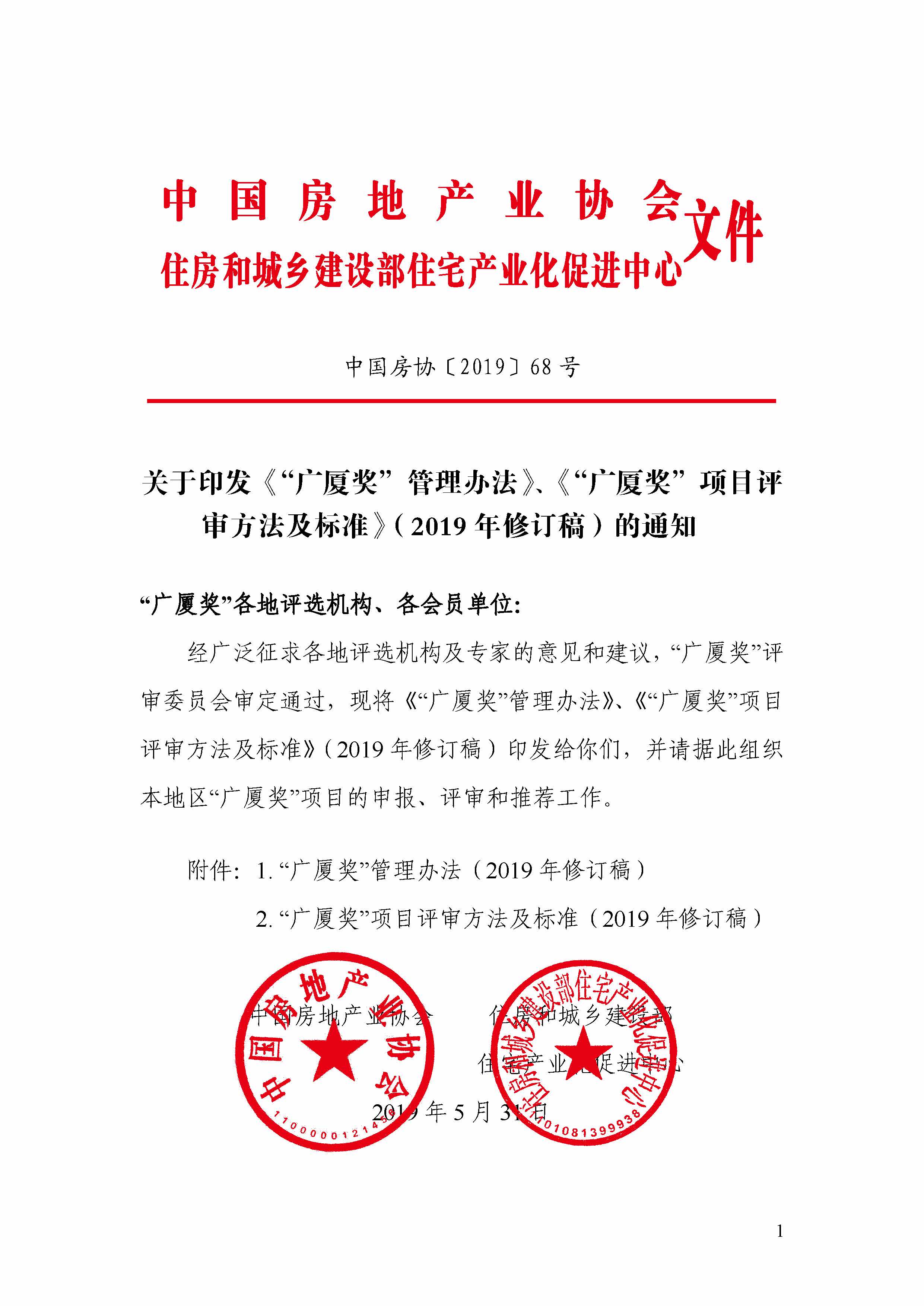 關于印發《“廣廈獎”管理辦法》、《“廣廈獎”項目評審方法及標準》(2019 年修訂稿)的通知