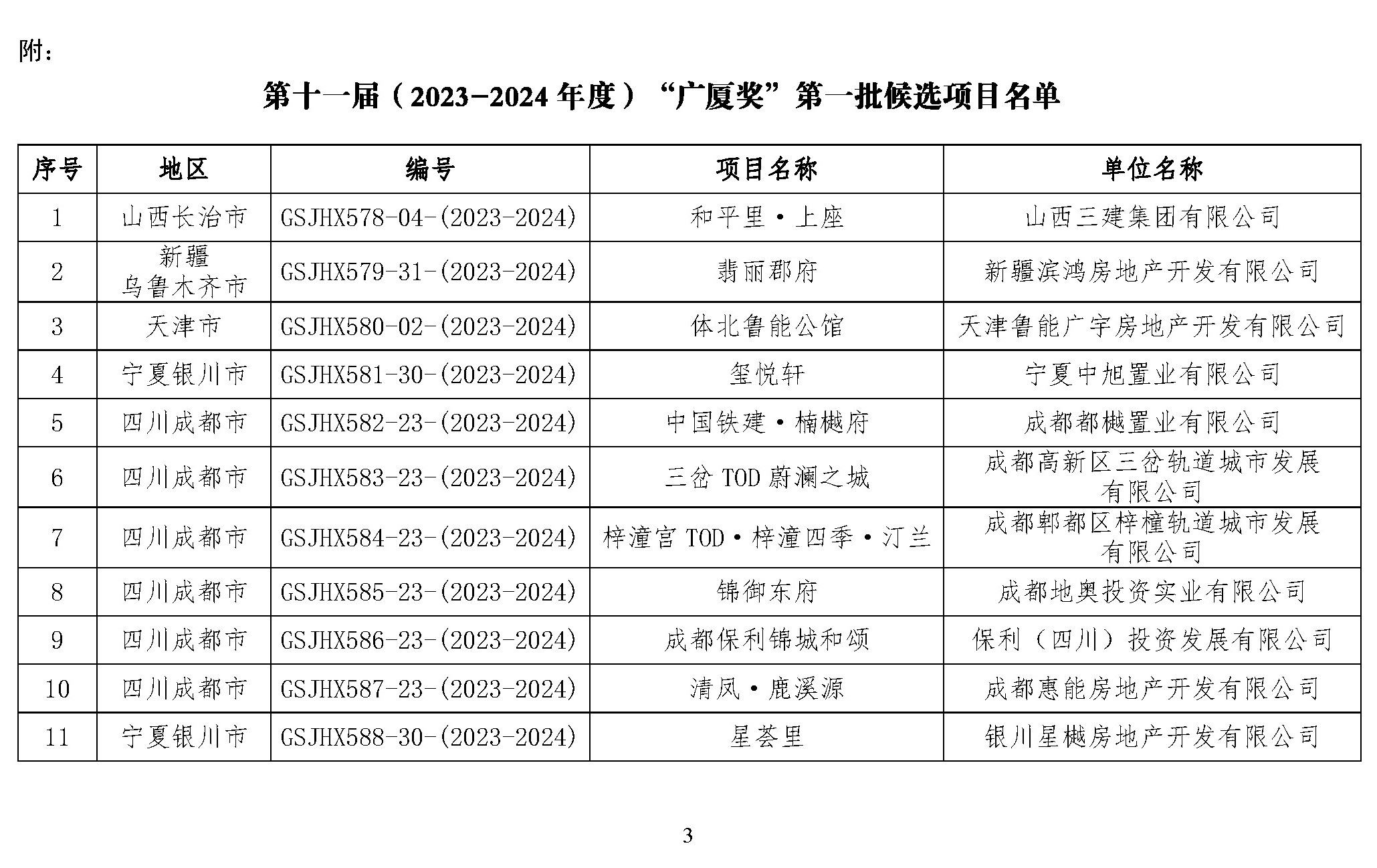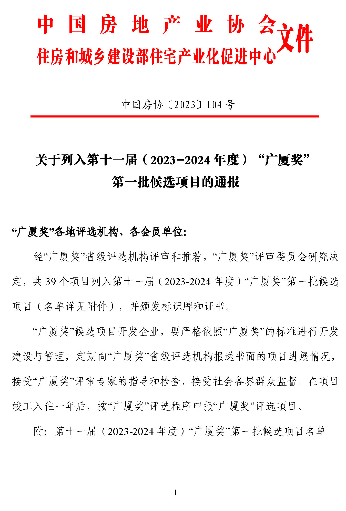關于列入第十一屆(2023-2024年度)“廣廈獎”第一批候選項目的通報