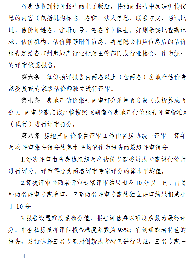 三、《辦法》第八條修改為:“房地產(chǎn)估價(jià)報(bào)告評審工作由省房協(xié)統(tǒng)一評審。每年兩次評審報(bào)告得分的算術(shù)平均值作為報(bào)告的最終評審得分。1.每次評審由省房協(xié)組織兩名估價(jià)專家委員或?qū)<壹壒纼r(jià)師進(jìn)行評分,評審得分為兩名評審專家評分的算術(shù)平均值。2.每次評審當(dāng)兩名評審專家評審結(jié)果相差10分以上時,由另外兩名評審專家重審,直至兩名評審專家的獨(dú)立評審結(jié)果相差小于10分。3.報(bào)告設(shè)置難度系數(shù)分值,報(bào)告評估乘以難度系數(shù)為最終評分。單套私房抵押評估報(bào)告難度系數(shù)為95%;有創(chuàng)新或者特色的報(bào)告,另行選擇三名專家對創(chuàng)新或者特色進(jìn)行認(rèn)證,三名專家一致同意后確認(rèn)難度系數(shù),其難度系數(shù)分值區(qū)間為105%—110% 。”